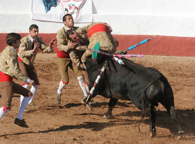 Para o nosso segundo da tarde foi chamado o forcado João guerreiro, moço este que também se estriou pela primeira vez a pegar em praças portuguesas. Este citou com classe e encheu bem a cara do oponente, pisou os terrenos do toiro mas com rapidez se sacou dos mesmos e recebendo com classe ejectou uma viajem segura sem qualquer dificuldade, o grupo bem a ajudar e a fechar em tábuas demonstrando coesão .